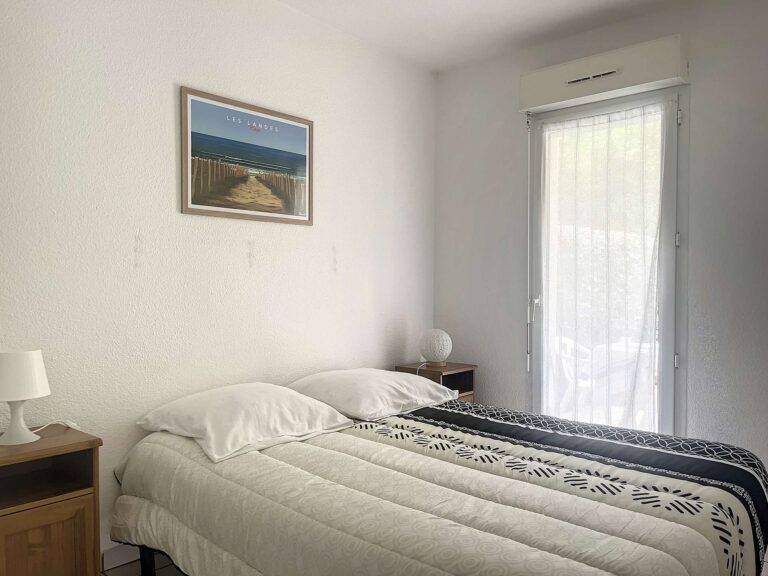 Composition : Séjour/cuisine : canapé convertible, télévision, baie vitrée donnant sur la terrasse, cuisine équipée (lave-vaisselle, réfrigérateur-congélateur, micro-ondes, cafetière filtre, grille-pain, plaques induction), salle de bains : baignoire, vasque, WC, placard avec lave-linge. Chambre : lit double, grand placard, porte-fenêtre donnant sur la terrasse. Terrasse carrelée avec salon de jardin. 1 place de parking privative. Capacité d’accueil : 2/4 personnes.