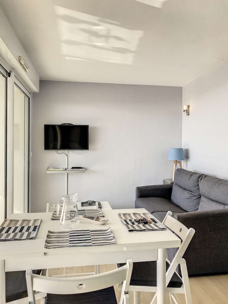 Composition : Entrée, séjour (canapé convertible, télévision écran plat, baie vitrée donnant sur le grand balcon), coin cuisine équipée (frigo/congélateur, micro-ondes, four, grille-pain, cafetières filtre + Senséo, plaque induction, lave-linge…), 1 chambre avec lit en 140*190, 1 chambre avec 2 lits superposés (90*190 et 120*190), salle d’eau, WC séparé. Grand balcon offrant une vue imprenable sur la plage (salon de jardin et chaises longues). Capacité d’accueil 4/6 personnes. 1 place de parking privative.